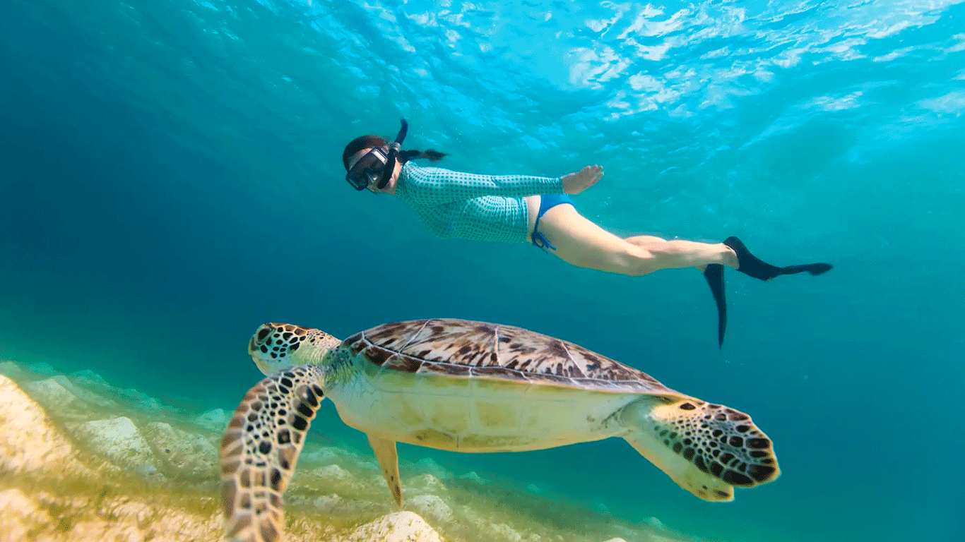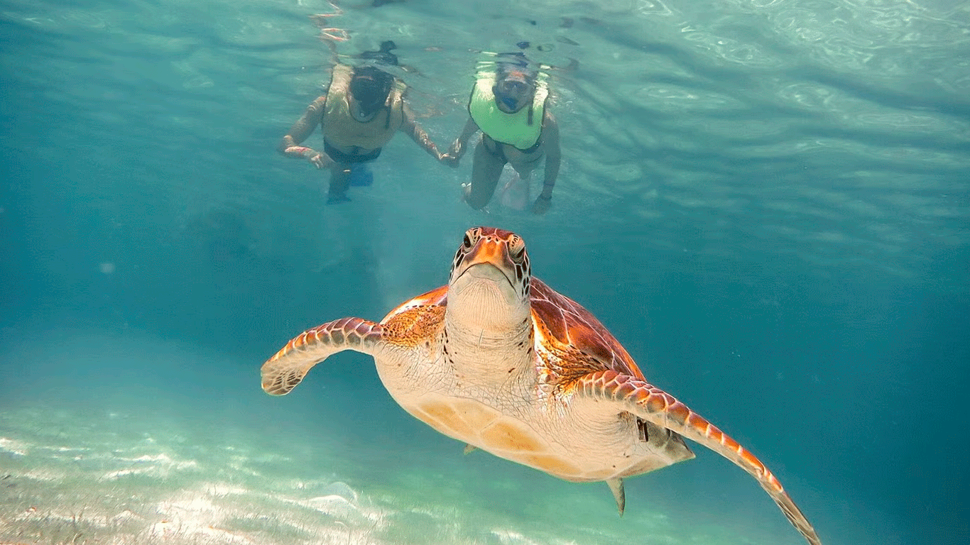Dive into the crystal-clear waters of Akumal Bay, where you’ll have the thrilling opportunity to swim alongside majestic sea turtles in their natural habitat. As you glide through the pristine waters, marvel at the vibrant coral reefs and colorful marine life that call this underwater paradise home.